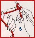 1. Glisser la boucle sur l'aiguille que l'on tient dans la main droite. 2. Tenir le fil le plus court de la main gauche, l'enrouler autour du pouce gauche. 3. Piquer la pointe de l'aiguille dans la boucle formée sur le pouce. 4. Enrouler le fil venant de la pelote, autour de l'aiguille, en le passant par-dessous et au-dessus de celle-ci, puis le ramener à travers la boucle. On obtient ainsi une boucle ou maille que l'on garde sur l'aiguille. 5. Resserrer la maille sur l'aiguille en tirant sur le fil tenu dans la main gauche, puis enrouler à nouveau le fil autour du pouce. 6. Former une nouvelle maille en répétant les mouvements des figures 3, 4 et 5.