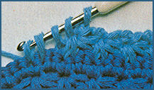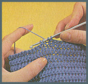 1. Relief dessus: après la maille lisière, faire 1 jeté sur le crochet, puis piquer le crochet entre la 1ère et la 2ème maille du rang précédent, d'avant en arrière pour le ressortir à gauche, entre la 2ème et la 3ème maille, d'arrière en avant. Faire un jeté sur le crochet et le tirer en boucle entourant la 2ème maille du rang précédent. Terminer la bride normalement. Continuer en piquant encore le crochet entre les deux mailles d'où il est ressorti au mouvement précédent, pour le ressortir entre les 2 mailles suivantes. Ainsi chaque bride est entourée par le fil. 2. Relief dessous: procéder comme pour le relief dessus, mais en piquant le crochet d'arrière en avant, pour le ressortir à gauche, d'avant en arrière. Faire un jeté sur le crochet le tirer en boucle, entourant la maille du rang précédent, par devant le travail. Terminer la bride normalement. Au rang suivant, le travail ayant été tourné, les brides qui étaient en relief dessus se présentent en relief dessous et celles qui étaient en relief dessous se présentent en relief dessus. Travailler chaque bride comme elle se présente. 3. Relief alterné: ce n'est qu'au rang suivant qu'il faut changer, et travailler en relief dessous celles qui se présentent en relief dessus et en relief dessus celles qui se présentent en relief dessous. Inverser ainsi tous les deux rangs.