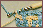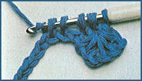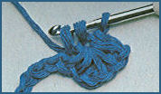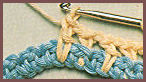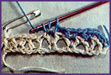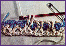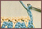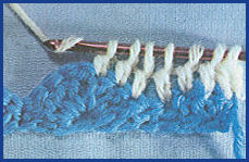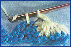 après avoir coulé la boucle tirée et le jeté qui la suit sur le crochet, piquer le crochet dans la boucle beige de la fin du rg précédent, faire 1 jeté et couler ensemble les 3 boucles qui sont sur le crochet. Puis prendre la couleur beige et le tirer en boucle au travers de la boucle de couleur bleu qui est sur le crochet, faire 1 m. en l'air et tourner;