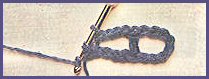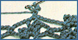 2 m. en l'air, 1 bride dans la 1ère m., *sauter 1 m., 2 brides dans la m. suivante*. Aux rang suivants: 3 m. en l'air, 1 bride entre les 2 premières brides *2 brides en piquant le crochet entre les 2 brides suivantes, 1 m. en l'air*.