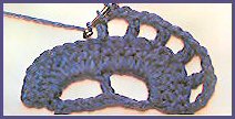 4ème rg: passer la 1ère br. qui se présente, puis faire *3 br. dans le 1er jour de m.a. suivant, 1 br. dans la br. qui suit et reprendre à *, ceci 9 fois; puis 3 br. dans l'arceau du bord et 1 br. dans la 3ème m.a. faite à la fin de l'avant-dernier rg pour tourner, 6 m.a. et tourner;