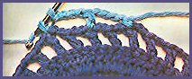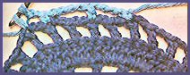 Revenir au début du 2ème rg, pour travailler sur la même face du travail. Piquer le crochet dans la dernière boucle de couleur bleu de l'avant-dernier rang et, avec la couleur bleu, faire 4 m. en l'air, puis *1 br. en piquant le crochet dans la 2ème m.s. de l'avant dernier rg (= 1er rg au-dessus des m. en l'air), d'avant en arrière, 1 m. en l'air, passer la br. du rg précédent et faire 1 br. derrière, en piquant le crochet dans la 1ère m.s. libre de l'avant-dernier rg (qui se présente sur la face arrière du travail), 1 m. en l'air,*. Répéter de * à * tout le long du rg qui doit se terminer par 1 br. piquée derrière dans la dernière m.s. de l'avant-dernier rg.5. Faire cette dernière br. comme suit: