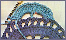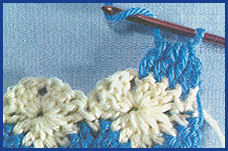 6ème rg: se trav. dans le même sens que le 5ème rg, sans tourner le travail. Faire, toujours dans la 8ème br. où a été accrochée la laine, 1 m.s., puis à la suite, faire 4 m.a., passer 1 m.a., 1 br. et 1 m.a. du rg précédent et faire 1 br. dans la br. qui suit, puis 4 m.a., passer 1 m.a., 1 br., 1 m.a. du rg précédent et faire 1 m.s. dans la br. suivante.5. À la suite de ces 2 arceaux, qui préparent le rg suivant, terminer ce rang par 2 m.a., passer 1 m.a. et faire 1 m.s. dans la br. du rg précédent qui se présente, tourner. 6. 7ème rg: faire 9 br. dans le 1er arceau de 4 m.a. qui se présente, 1 br. dans la br., 10 br. dans l'arceau suivant et, à la suite, faire 1 m.c. dans la 1ère br. du motif précédent qui suit la br. où a été accroché le 2ème coloris de laine, 2 m.a. et tourner;