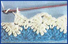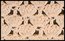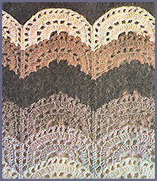 1er rang: commencer par le point par 1 m.s. pour la lisière, continuer par 1 m.s. dans la m. suivante, puis *passer 2 m. de la chaînette, puis dans la m. chaînette suivante, faire: 3 br., 1 m. en l'air, et 3 br. pour former la coquille, passer à nouveau 2 m. de la chaînette pour faire 1 m.s. dans la m. chaînette qui suit*. Reprendre de * à * jusqu'à la 5ème m. avant la fin. Les 4 dernières m., pour terminer le rang, sont ainsi employées: passer 2 m. chaînette et faire, pour une demi-coquille, 3 br. dans la m. suivante et enfin 1 br. pour la lisière. Pour les 2ème et 3ème rgs, prendre la deuxième couleur, et pour les 4ème et 5ème rgs, reprendre la première. Un rang sur deux, le haut du travail forme une vague...
