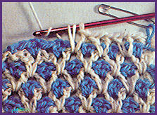 Ce ne sont que des rangs de mailles serrées séparées par une maille l'air, surmontés de rangs de brides. Toute l'astuce est dans la manière de piquer le crochet dans les mailles des rangs précédents pour faire les brides. Le "bicolore" s'obtient en travaillant un rang avec une couleur et un rang avec l'autre.