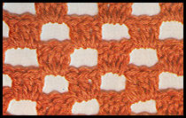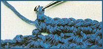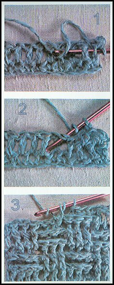 Sur les mailles chaînette de montage, faire le 1er rg (env. du travail): 1 d.br. dans chacune des m. en l'air du travail; terminer par 1 m. en l'air et tourner. 2ème rg: (end. du trav.): faire 1 m.s. dans chacune des d.br. du rg précédent, mais en piquant le crochet sous le fil arrière de chaque m.; terminer par 2 m. en l'air pour tourner. 3ème rg: (env. du trav.): faire 1 d.br. dans chaque m.s. du rg précédent; terminer par 1 m. en l'air pour tourner. Répéter toujours les 2ème et 3ème rangs.