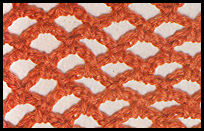 Faire 5 m. en l'air pour tourner, puis 1 m. serrée dans la 3ème de la chaînette, *5 m. en l'air, 1 m. serrée en sautant 3 m. de la chaînette*. Aux rangs suivants, faire 5 m. en l'air pour tourner, puis *1 m. serrée prise dans la m. du milieu des 5 m. en l'air du rang précédent, 5 m. en l'air*; term. par 1 m. serrée dans la 3ème m. en l'air.