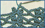1. Au 2ème rg et ts les rgs pairs: faire, en piquant le crochet dans les jours en "V" exécutés au rg précédent: 1 m.s., 1 picot (= 4 m. en l'air, puis piquer le crochet dans la 1ère de ces 4 m. en l'air pour y faire 1 m.s.), pour faire: 1 m.s., 1 picot, et 1 m.s. Entre chaque groupe de picots et de m.s., il y a 7 m. en l'air. 2. Au 3ème rg et ts les rgs impairs: en piquant le crochet dans la m. placée entre les 2 picots du rang précédent, faire: 1 br., 2 m. en l'air et 1 br., ce qui forme un petit jour en "V". Entre chaque groupe de br. et de m. en l'air (= entre chaque jour en "V") faire 4 m. en l'air, quand il y en a 7 au rang précédent; puis faire 1 m.s. dans la m. en l'air du milieu des 7 faites au rang précédent. À nouveau 4 m. en l'air avant le prochain jour en "V", et ainsi de suite.