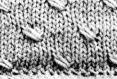 5ème rg: 1 m. lis., 3 m. end.,* 1 jeté, piquer l'aig. droite entre la 7ème et la 8ème m. suivante, ramener le fil sur le dessus et tric. ens. la longue boucle obtenue et la 1ère des 7 m. qui se trouvent prises dans cette boucle. Tric. ensuite les 6 m. enlacées comme suit: 1 m. end., 1 surjet double, 2 m. end. Faire à la suite 1 jeté, 5 m. end.*; terminer le rang par 3 m. end., 1 m. lis.