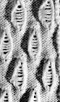 5ème et 7ème rg: 1 m. lis., *passer le fil devant, 3 m. glissées, passer le fil derrière, 2 m. end.*; terminer le rang par 2 m. end., 1 m. lis.