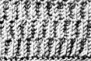 1er rg: (endroit du travail): *5 m. end., dans la m. suivante, tricoter 5 m. en piquant alternativement sous le brin avant et sous le brin arrière de la m.*. Terminer le rang par 5 m. end.