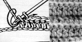 1er rg: *1 jeté, piquer le crochet dans la 3ème m. chaînette, 1 jeté, tirer le fil, 1 jeté, écouler les 3 boucles en 1 fois; reprendre à * dans la maille suivante.
