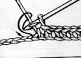 2ème rg: 1 m. en l'air pour tourner, *piquer le crochet sous les 2 brins horizontaux de la 1ère m. du rg précédent, 1 jeté, tirer 1 m., 1 jeté, écouler les 2 boucles; reprendre à * en piquant dans la maille suivante.