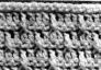 3ème rg: 2 m. en l'air pour tourner, *1 bride sur chacune des 3 m. serrées suivantes, puis 1 double bride en piquant le crochet horizontalement de droite à gauche sous la 4ème bride du 1er rg en passant par-dessus la maille serrée du 2ème rg (c'est 1 double bride en relief). Reprendre à *.