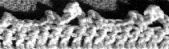 4ème rg: 1 m. serrée, *sauter 1 m. dans la 2ème m., faire: 1 demi-br., 2 br., 1 dble br., 2 br., 1 demi-br., sauter 1 m. 1 m. serrée*. Répéter de * à *. Avec une laine de couleur, faire 1 maille coulée sur chaque tête de br. (7 par dent) et 1 sur la maille serrée.
