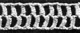 1er rg: dans la 4ème m. chaînette, faire 1 br., puis une 2ème br. dans la m. suivante. *Ensuite faire 4 jetés, piquer le crochet dans la m. suivante, 1 jeté, écouler 2 boucles, 1 jeté, écouler 2 boucles, faire 2 nouveaux jetés et piquer le crochet dans la 7ème m. suivante, 1 jeté, écouler 2 boucles, puis écouler les boucles 2 par 2 jusqu'à ce qu'il n'en reste qu'une. Faire 7 m. en l'aire, puis 2 jetés et piquer le crochet au sommet des 2 br. reliées, 1 jeté et écouler les boucles 2 par 2. On obtient une sorte de X entre 2 arceaux. Faire ensuite 3 br. sur les 3 m. de la chaînette qui se présentent. Reprendre à *. Trav. ainsi jusqu'à la fin de la chaînette.
