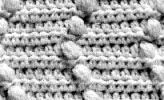 2ème rg: 3 m. pour tourner, 1 br. (# 7) dans chacune des 2 premières mailles en piquant le crochet sous le fil horizontal arrière, *ensuite dans la maille suivante faire 1 mouchet, pour cela faire 1 jeté, piquer le crochet, 1 jeté, tirer le fil, 1 jeté, piquer le crochet dans le même point, 1 jeté, tirer le fil, 1 jeté, piquer le crochet une 3ème fois dans le même point, 1 jeté, tirer le fil, 1 jeté, écouler toutes les boucles du crochet en 1 fois, 1 m. en l'air pour fermer, puis 1 br. dans chacune des 4 m. suivantes*. Répéter ces 2 rangs. Au 3ème rg, faire 1 m. serrée sur chaque br. et 1 sur la maille de fermeture du mouchet.