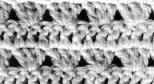1er rg: 3 m. serrées à la suite, la 1ère étant faite sur la 3ème m. chaînette, puis *3 m. en l'air, sauter 3 m. et 3 m. serrées sur les 3 m. suivantes*. Terminer le rang par 3 m. serrées.