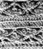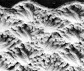3ème rg: *faire 1 double bride en piquant le crochet horizontalement de droite à gauche sous la 5ème bride du 1er rg, 9 m. serrées en commençant sur la 1ère bride derrière la double bride, puis 1 double bride dans le même point que la 1ère et en piquant le crochet de la même façon; reprendre à * en piquant le crochet dans la 2ème bride suivante et en terminant ensemble les 2 doubles brides qui se joignent afin qu'il n'y ait qu'une seule boucle pour les 2, ensuite faire 1 m. serrée derrière le point de jonction.