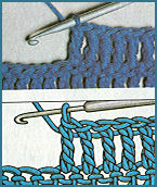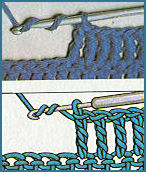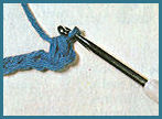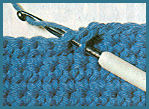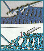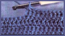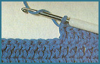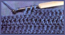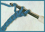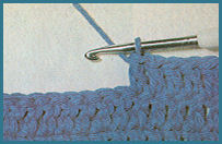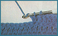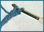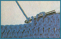1er rang: Faire 2 m. chaînette pour tourner, puis, *piquer le crochet dans la 1ère m. de la chaînette de montage, faire 1 jeté (passer le crochet de la gauche vers la droite, sous le fil à tricoter); tirer ce jeté à travers la 1ère m. qui se trouve sur le crochet; faire 1 jeté et le tirer à travers les 2 m. du crochet*. On a formé une maille serrée. répéter de * à * dans ch. m. de la chaînette montée.(voir dessin)Voici une autre explication pour la maille serrée, à vous de choisir l'explication que vous comprenez le mieux.