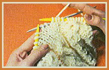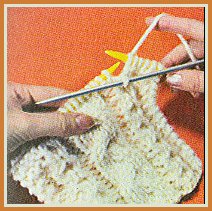 7ème rg: 9 m. env., glisser les 3 m. end. suiv. sur la 3ème aig. et les laisser en attente derrière le travail; tric. à l'endroit les 3 m. suivantes, puis les 3 m. en attente 9 m. env.