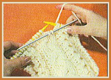 2ème rg: end. du travl: sur les 4 m. end., trav. ainsi: glisser sur 1 aig. auxiliaire la 1ère m. et la laisser en attente derrière le travail; puis, tric. la m. suivante et, à la suite, la m. en attente à l'endroit; glisser sur 1 aig. auxiliaire la m. qui suit et la laisser en attente devant le trav., tric. la m. suivante et, à la suite, la m. en attente, à l'end. 3ème rg: tric. les m. comme elles se présentent.
