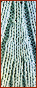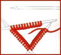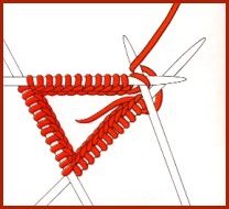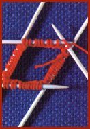 Le montage des mailles ne change pas. En ce qui concerne les aiguilles, il y a 2 manières. Bien que l'on utilise plusieurs aiguilles - pour un grand pull (au moins 5 ou 6) - tricoter avec une seule aiguille le total des mailles étant réparti sur les autres. On peut, monter un certain nombre de mailles sur la 1ère aiguille, puis en faire autant sur une 2ème aiguille et ainsi de suite, ou monter toutes les mailles sur une aiguille et les glisser ensuite sur les autres aiguilles. La 2ème méthode est probablement plus facile. Pour commencer à tricoter, piquer l'aiguille restante dans la 1ère maille de la 1ère aiguille et tricoter cette maille en utilisant le fil de la dernière maille montée pour fermer en rond. Continuer à tricoter toutes les mailles de 1ère aiguille. Lorsqu'il ne reste plus de maille sur cette aiguille, utiliser cette dernière pour tricoter les mailles de la 2ème aiguille. Continuer ainsi. C'est tout ce qu'il y a à faire pour tricoter en tournant. Comme l'on tricote toujours sur l'endroit, 2 tours à l'endroit donnent du point jersey et non pas du point mousse comme lorsqu'on tricote par rang. Pour le point mousse, tricoter un tour à l'endroit, un tour à l'envers. Pour savoir où commencent les tours, marquer le début du tour par un fil de couleur différente que l'on ferme par un nœud et que l'on glisse sur l'aiguille avant de tricoter la 1ère maille du tour; glisser tout simplement ce fil sur l'aiguille droite sans le tricoter, tous les tours, pour qu'on puisse retrouver immédiatement le début des tours. Il se peut que l'on ait besoin de plusieurs repères, comme, par exemple, lorsque le patron nécessite des diminutions ou des augmentations, de part et d'autre d'un point par où passerait normalement une couture, ou bien sur le dos de la jambe d'un bas. Sur une jupe à lés, marquer chaque lé avec un fil d'une couleur et le début des tours avec un fil d'une autre couleur. Les photos ci-contre illustrent comment obtenir un effet de fausse couture nette grâce à des diminutions sur la jambe d'une chaussette, et comment la formation de panneaux s'élargissant graduellement peut donner une jupe à lés qui a du mouvement. Cet effet de panneaux est particulièrement indiqué pour une robe à jupe ample dont il faut réduire l'ampleur avant de commencer le corsage.