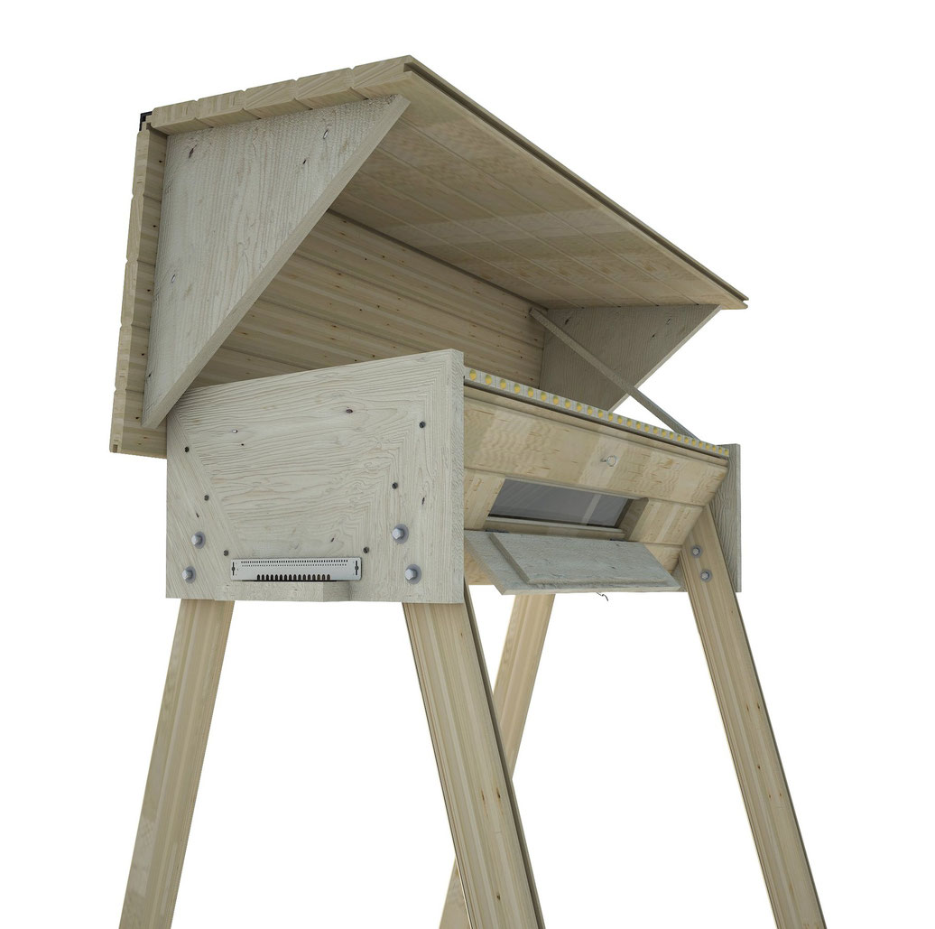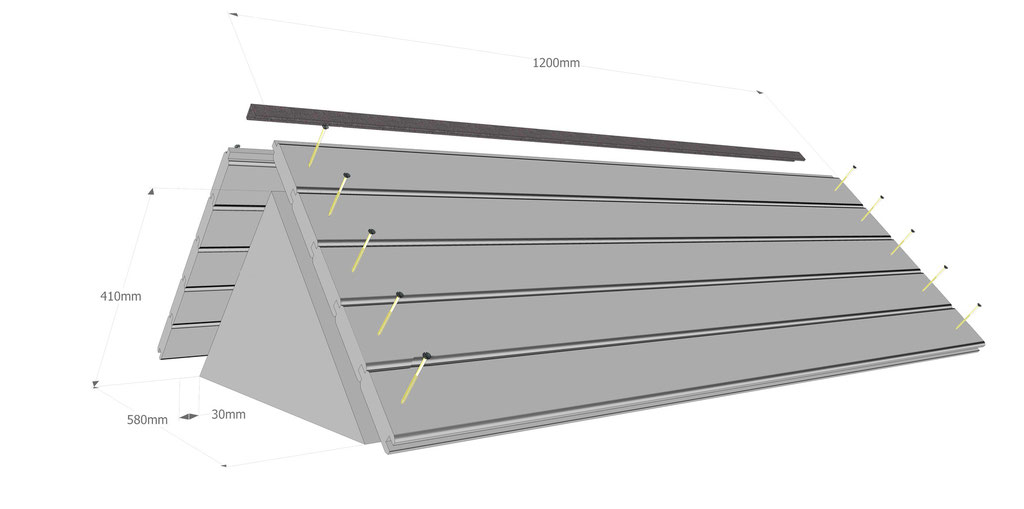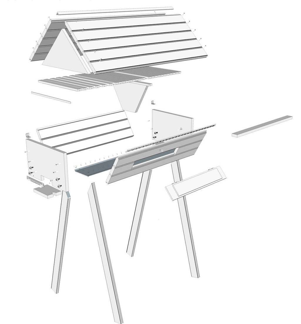 Pour le toit comme pour le corps de la ruche, les lames de volet recevront un filet de colle PUD4 dans la rainure avant assemblage. Celle colle est expansive, au bout d’une heure tous les interstices seront comblés et l’ensemble sera rendu très rigide. Bien veiller à laisser la colle agir sur les lames assemblées à plats, la face extérieure sur l’établi pour éviter les débords de colle à l’intérieur de la ruche.